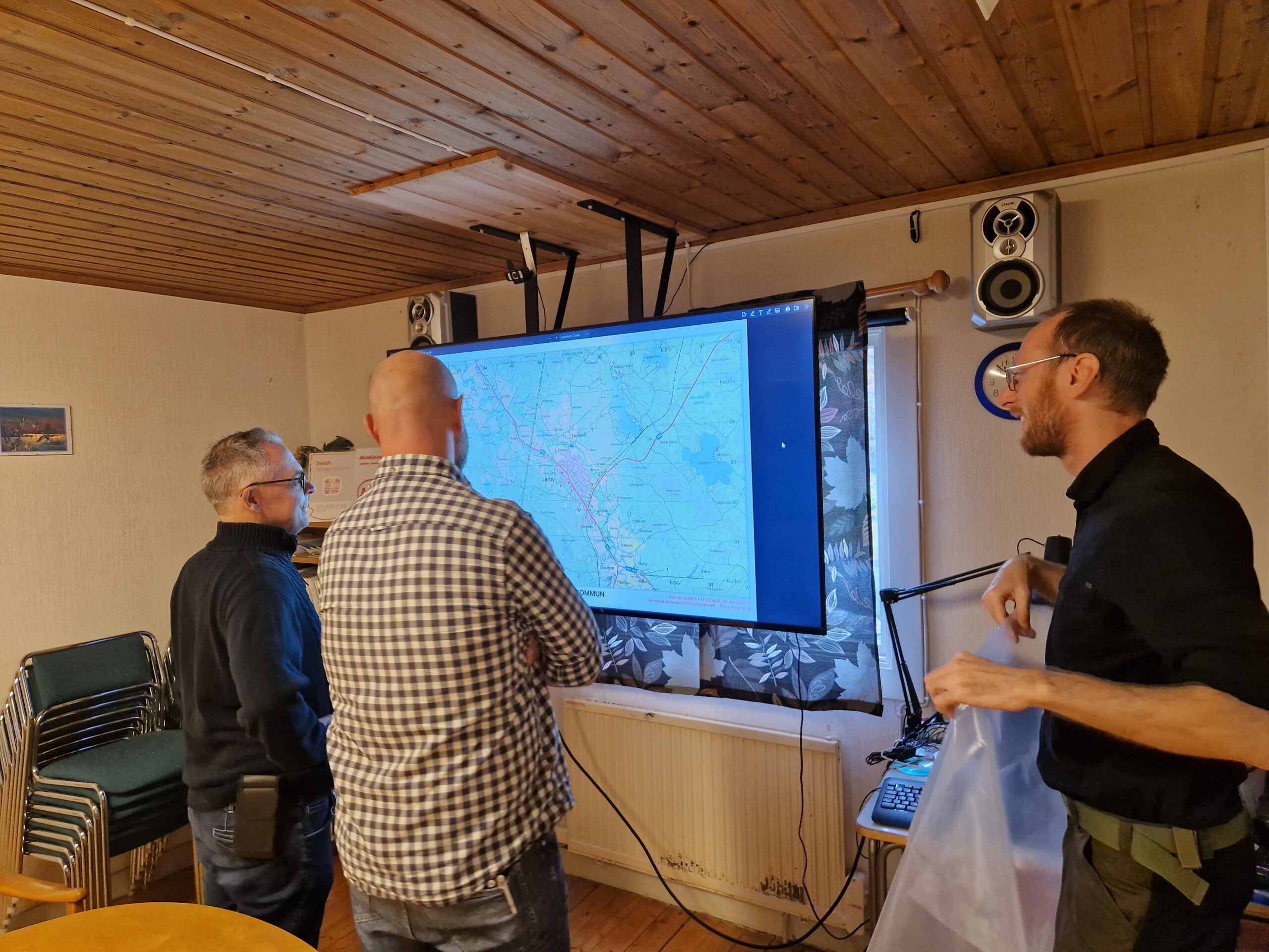 Här ser vi Martin, Erik och Simon vid lägeskartan